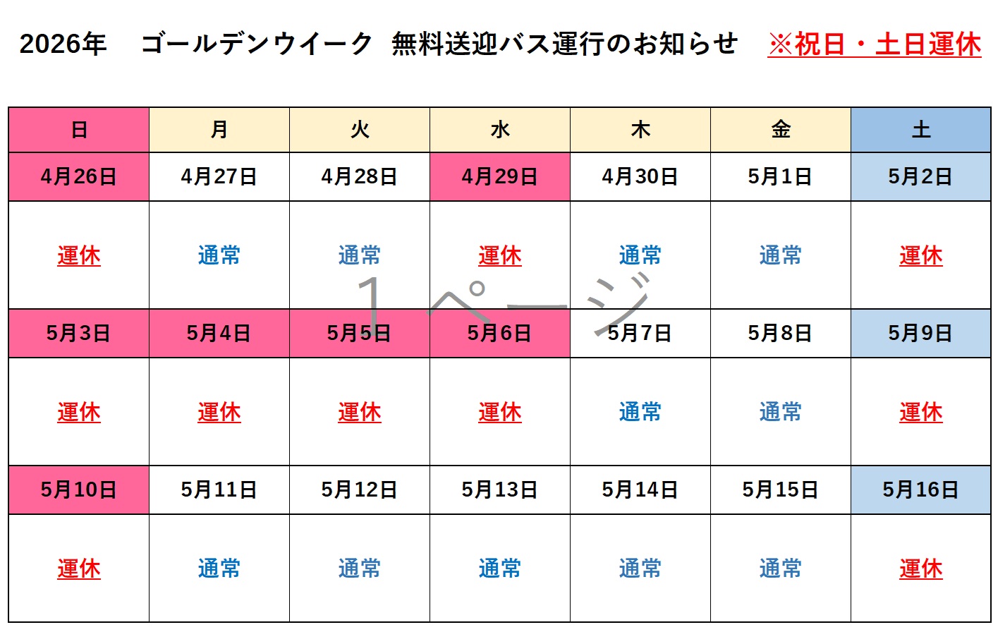 ゴールデンウイーク(祝日)の吉塚駅行き送迎車は、 下記の日程を運休とさせていただきます。